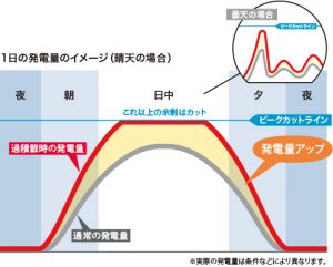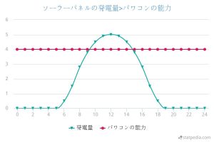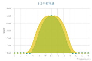 黄色で示したグラフは、最大の発電量が5kWですが、黄色部分の面積が先ほどの緑色より広くなっています。